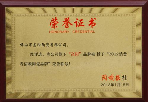 2013年高陽陶瓷被授予“2012消費者信賴陶瓷品牌”榮譽稱號